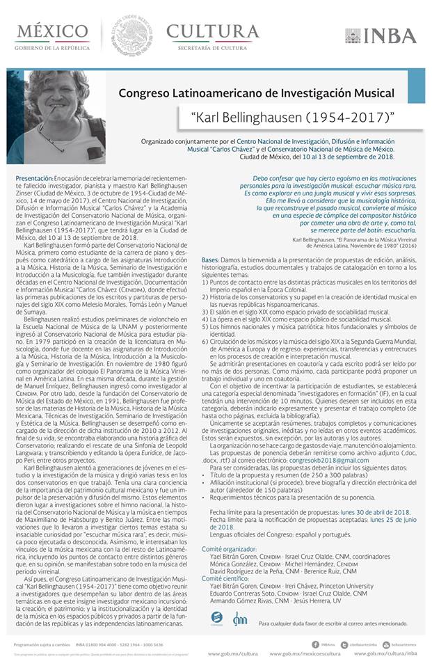 El Congreso Latinoamericano de Investigación Musical «Karl Bellinghausen (1954-2017)», recibe propuestas de edición, análisis, historiografía, estudios documentales, catalogación. La fecha límite de presentación de ponencias es el 30 de abril.