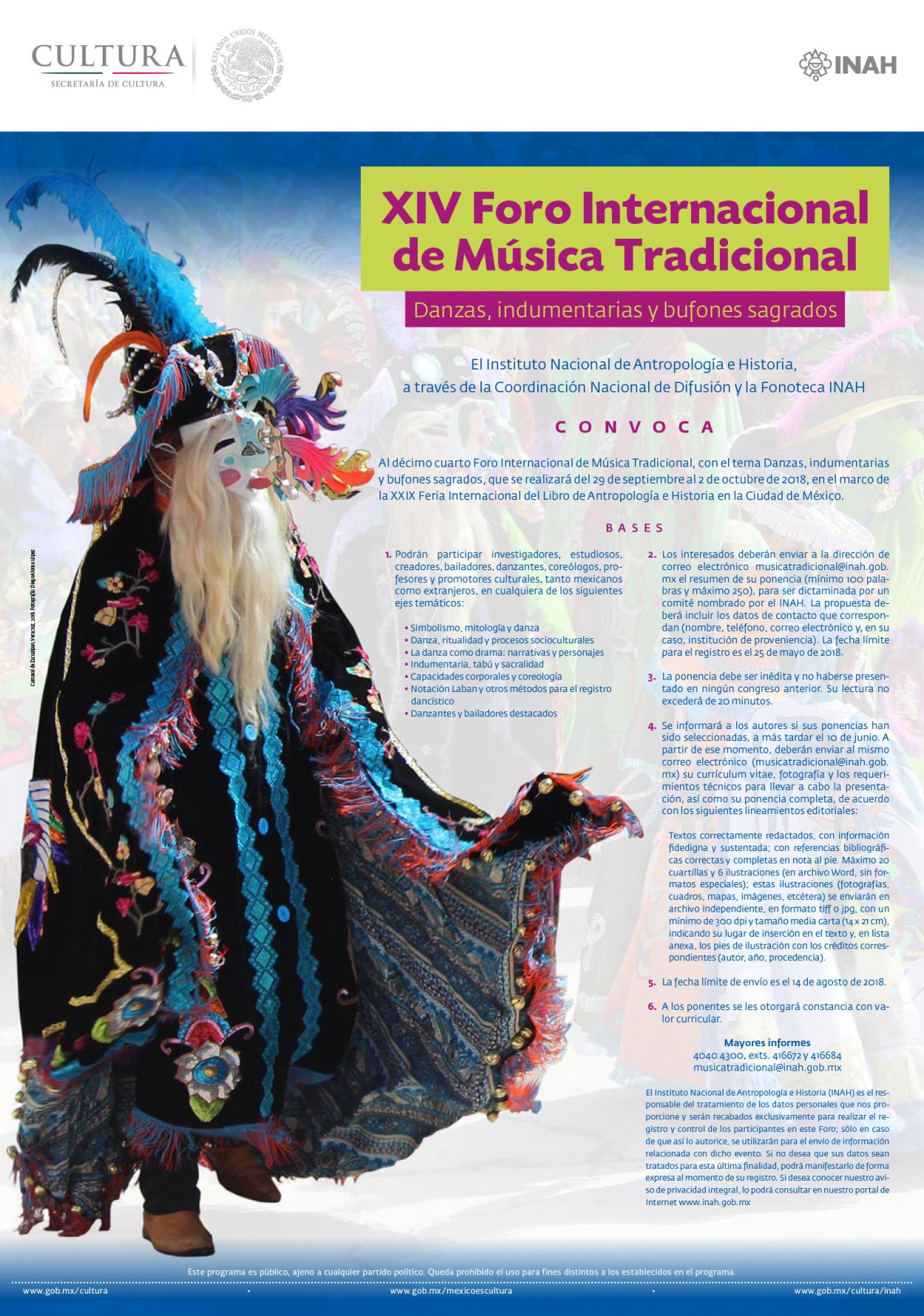 Convocatoria para participar en el XIV Foro Internacional de Música Tradicional, que se celebrará del 29 de septiembre al 2 de octubre del 2018 en el Museo Nacional de Antropología durante la XXIX Feria Internacional del Libro de Antropología e Historia.