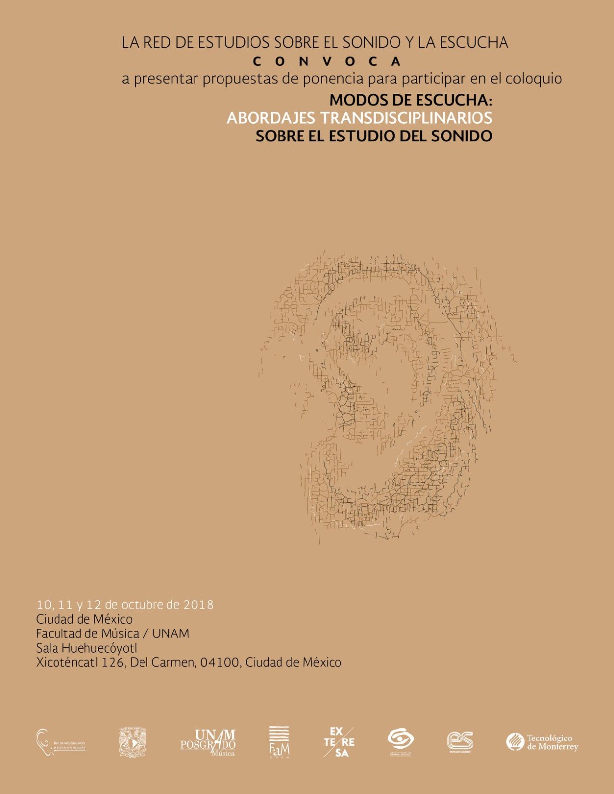 Coloquio “Modos de escucha: abordajes transdisciplinarios sobre el estudio del sonido” que tendrá lugar el 10, 11 y 12 de octubre del 2018 en la Facultad de Música de la UNAM.